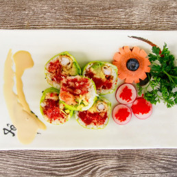 Crevette tempura, avocat, feuille de menthe Japonaise, caviar, mayo épicée, feuille de soya. Ext. (Thon flambé). / Shrimp tempura, avocado, Japanese mint leaf, caviar, spicy mayo, soy leaf. Ext. (Tuna flambé).