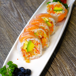 Arc-en-ciel saumon, tempura, caviar, concombre, mayo épicé. Ext. (Avocat, saumon, thon). / Rainbow salmon, tempura, caviar, cucumber, spicy mayo. Ext. (Avocado, salmon, tuna).